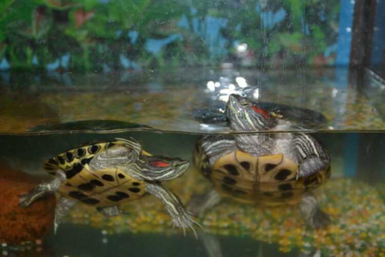 Красноухие черепахи – представители водного вида, а значит, большую часть жизни они проводят в воде. Качество жидкости должно быть соответствующим (едят, спят и ходят в туалет они тоже в воде). Как заботливый владелец, поставьте мощные фильтры и часто меняйте воду. Минимально возможный уровень жидкости в аквариуме определяется способностью питомца без труда перевернуться из положения «на спине» в положение «на брюшко».