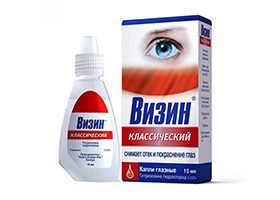 - «Визин» — снимает отеки и воспаление. Эффект наступает через несколько минут и не спадает до 8 часов. Лекарство не попадает в кровоток. (не рекомендовано для длительного использования, т. к. вызывает привыкание).