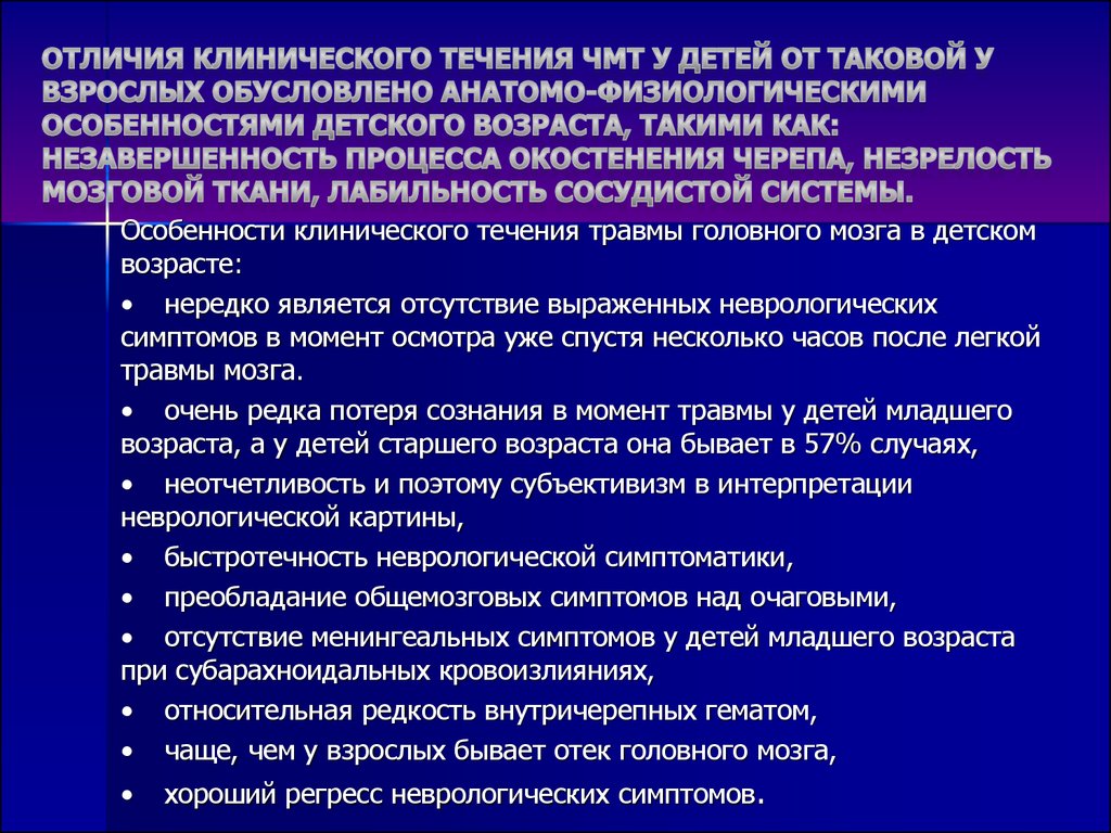 Отсроченное проявление клинической симптоматики приводит к ложному ощущению легкого течения ЧМТ у детей раннего и дошкольного возраста, а также к поздней госпитализации. В связи с особенностями развития организма детская ЧМТ выделена в отдельную классификацию.