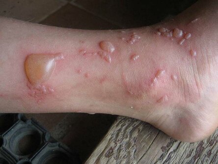Тяжелые повреждения борщевиком похожи на термические ожоги второй степени. На месте покраснения вздуваются пузыри, заполненные жидкостью. Покрышка пузыря лопается, ожог болит, мокнет, а затем подсыхает и постепенно заживает, не оставляя следа. Шрамы от таких ожогов появляются только при наличии осложнений. Если в ранку попала инфекция, гнойный процесс может повредить более глубокие участки кожи, и после заживления останется рубчик.