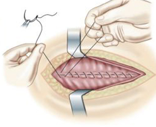 - фиксацию поражённой зоны в положении, обеспечивающем максимальное сближение разошедшихся частей мышцы;