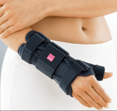 - Лучезапястный с фиксацией большого пальца. Ортез внешне напоминает браслет, который крепится на запястье, и имеет отдельно отходящую шину для фиксации большого пальца. Чаще применяется при повреждении связок в области проксимальной фаланги.