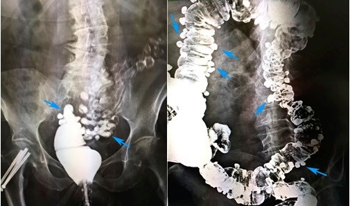 На рентгенологических снимках, выполненных при ирригоскопическом исследовании, отчетливо видны множественные дивертикулы ободочной кишки. Они выглядят как мешочки, заполненные рентгеноконтрастным препаратом.