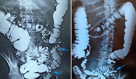 «Золотым стандартом» диагностики дивертикулярной болезни является ирригоскопия. Этот метод позволяет определить количество дивертикулов, их точное местоположение, размеры и форму. Суть процедуры заключается в введении рентгенконтрастного препарата в толстую кишку, после этого выполняется серия рентгенологических снимков, позволяющих оценить состояние толстой кишки. На представленных фотографиях стрелками указаны устья дивертикулов толстой кишки. Синими стрелками мы отметили множественные дивертикулы ободочной кишки. Именно так они выглядят при компьютерной томографии.