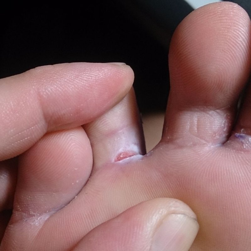 Второй путь развития грибка между пальцев более редкий (примерно в 8%). Это «мокрый», везикулярный или экссудативный грибок, при котором возникают лопающиеся пузырьки-везикулы и изъязвления после них. Такой мокрый микоз меж пальцами поражает людей при сильных стрессах, при долгих походах, ношении плохой, тесной, невентилируемой обуви, при неправильной терапии грибка, при самолечении антимикозами и кортикостероидами.